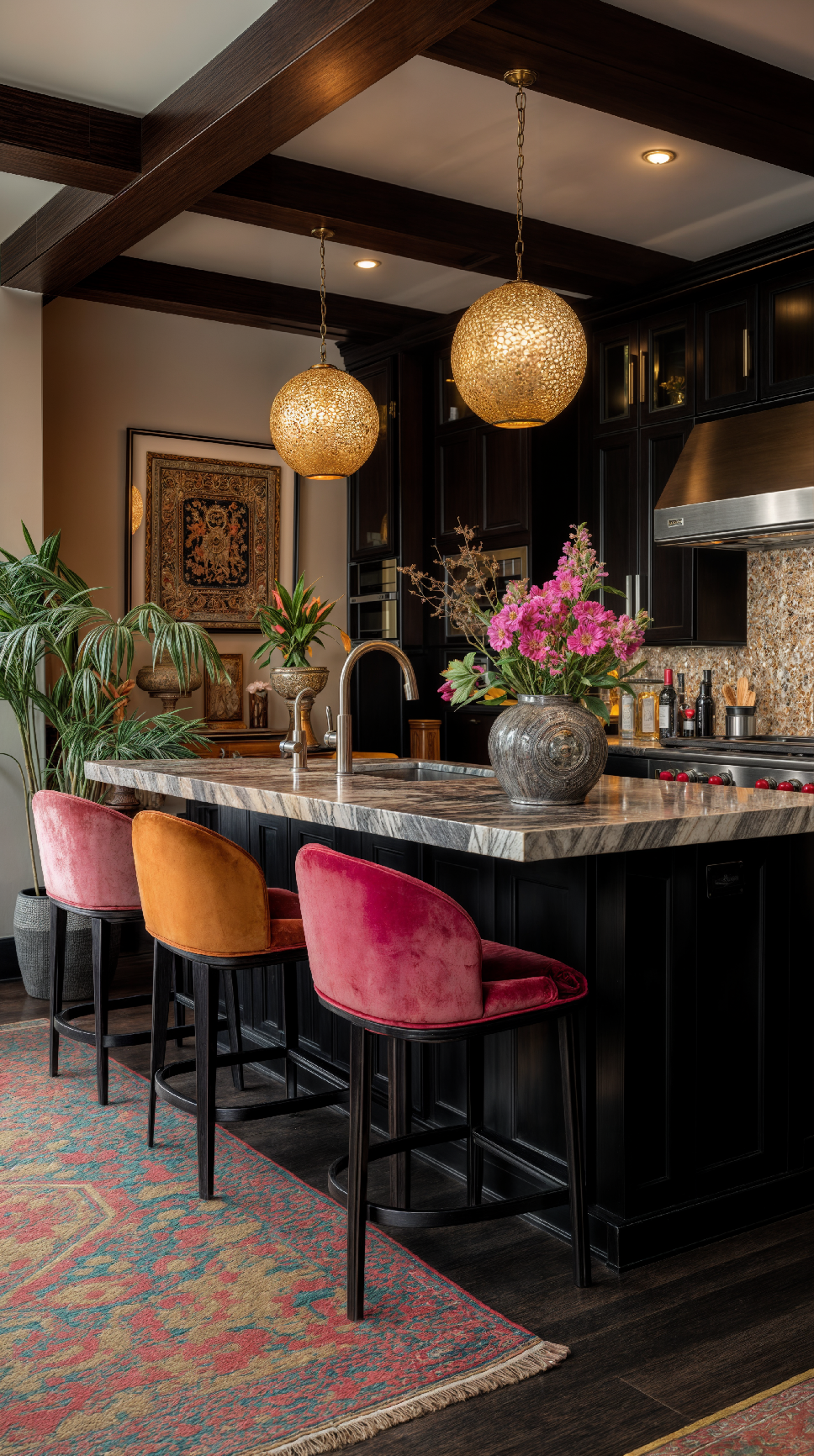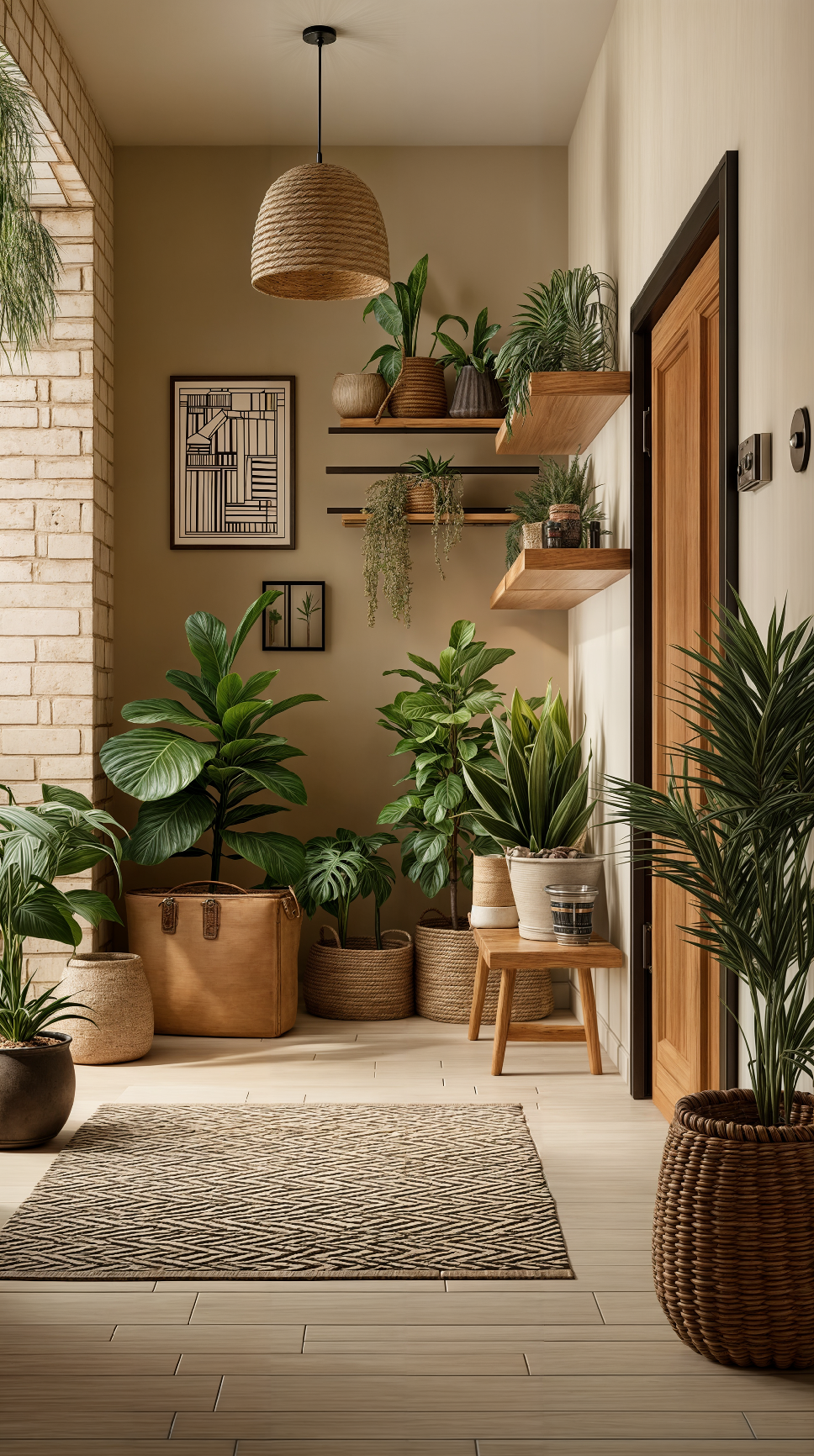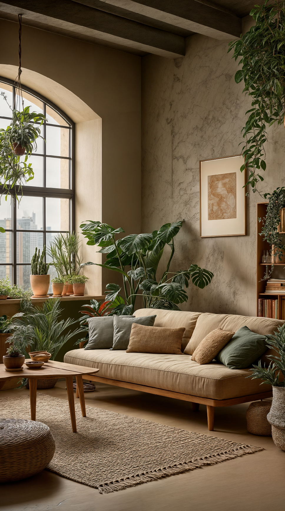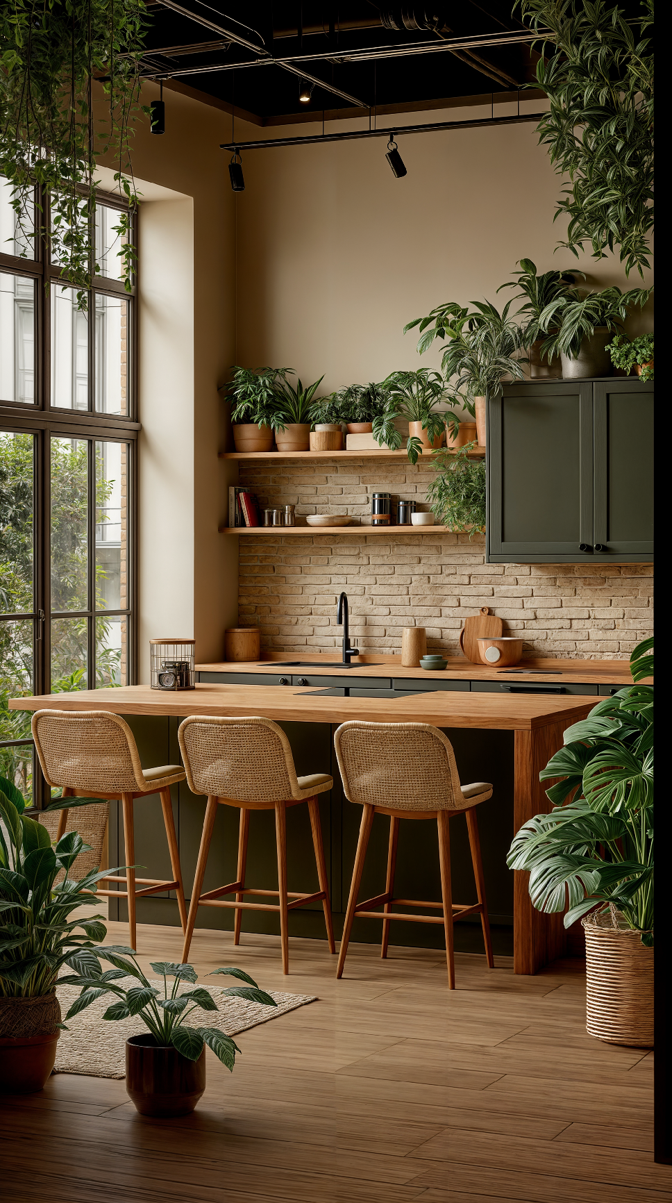 ДЕКОР: зелёные растения - главный и основной декор. Подходят: пальмы, монстеры, фикусы, филодендроны, папоротники, суккуленты, вьющиеся растения - в подвесных кашпо, в кашпо на ножках, на стеллажах. Дополнительный декор — текстиль с ботаническими мотивами, плетеные корзины, стеклянные вазы. Можно добавить несколько этнических или винтажных элементов: маски, ручную керамику, узорчатые ковры.