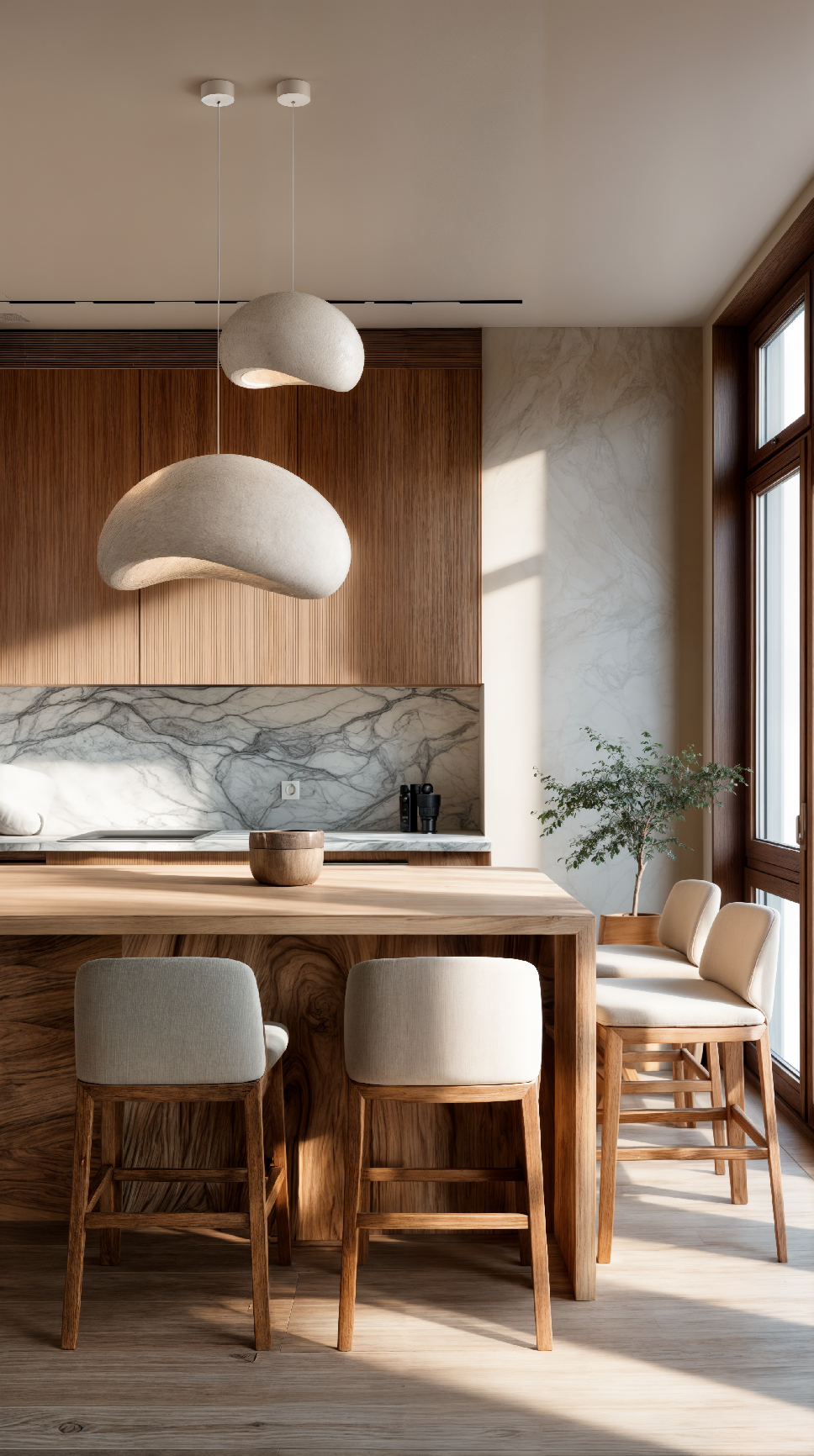 МЕБЕЛЬ: функциональная, низкая, с простыми линиями и мягкой геометрией. Много дерева, тонкие ножки, округлые формы, отсутствие декора ради декора. Японская часть — более строгая и графичная. Скандинавская — более тёплая, текстильная, визуально мягкая.