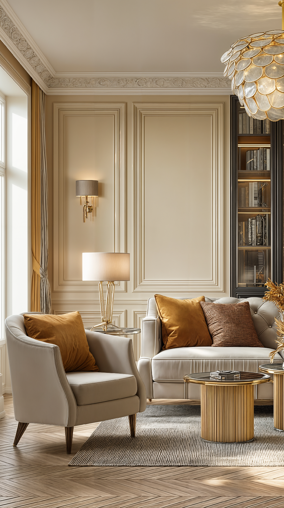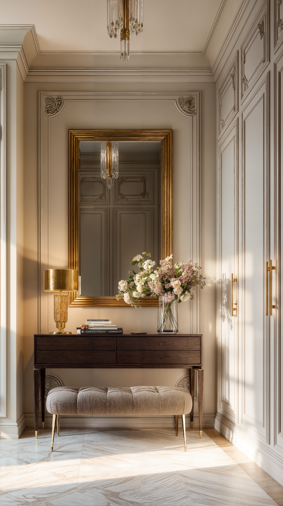 ДЕКОР: основным стилеобразующим декором в отделке служит декоративная лепнина - пилястры, карнизы, молдинги, розетки. Всего должно быть в меру - стиль не терпит перебора ни в чём. Аксессуары должны подчёркивать респектабельность, быть изящными. В текстильном оформлении и обоях могут встречаться ненавязчивые растительные мотивы, неактивная геометрия.