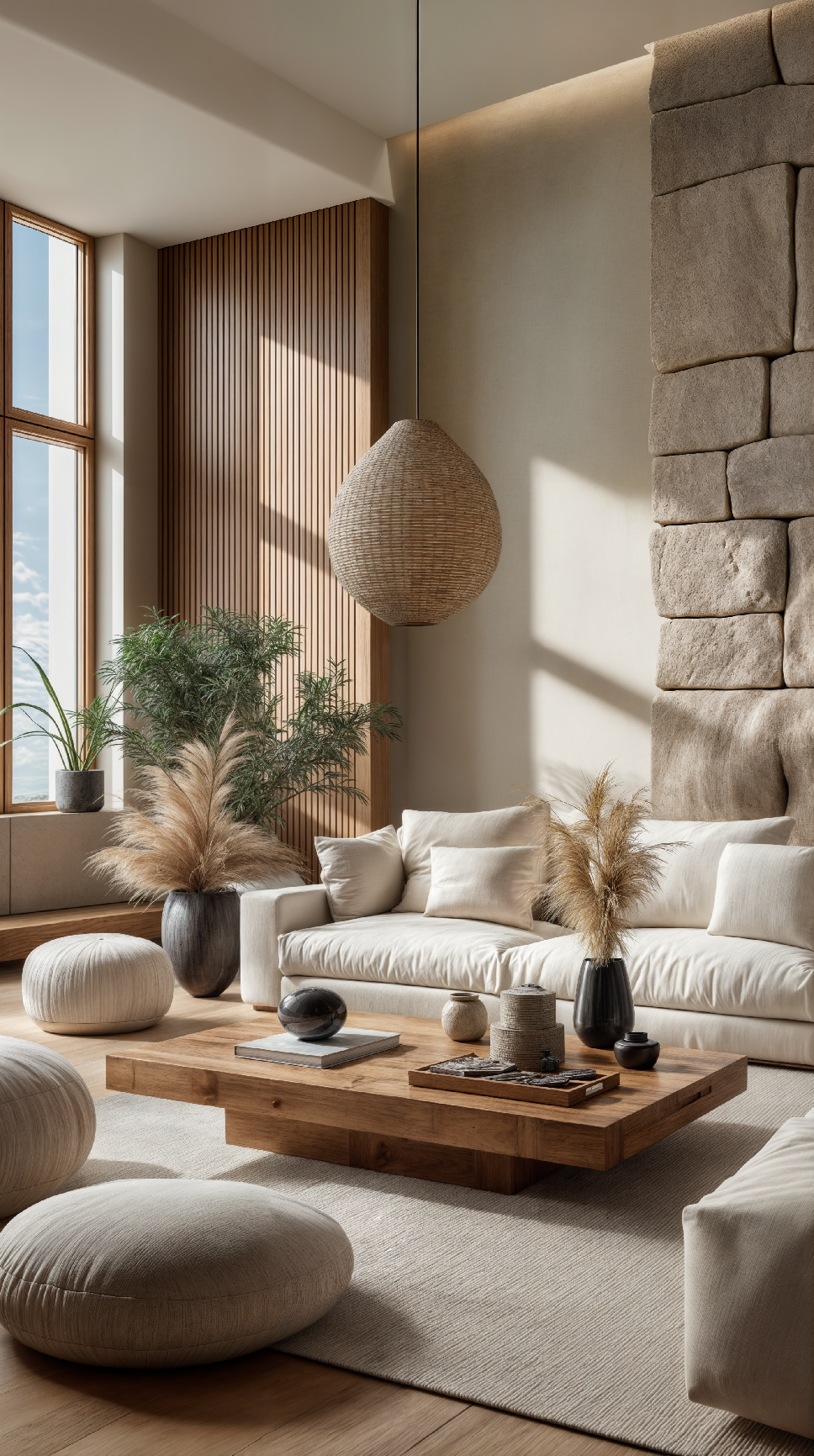 ЦВЕТА: нейтральная природная палитра: бежевый, песочный, кремовый, серый в мягких оттенках, теплый белый, древесные оттенки — от светлого дуба до тёмного ореха, акценты — чёрный, угольный, терракотовый, оливковый.